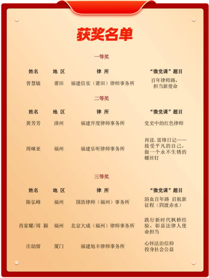 福州市律師協(xié)會:喜報!我市3部“微黨課”作品獲獎 福州律師資訊發(fā)布者 福州律師網(wǎng)2024年12月2日2024年9月,福建省律師協(xié)會黨建工作委員會在全省律師行業(yè)基層黨組織中開展“微黨課”(線上)競賽活動。參賽選手們結(jié)合自身詳情