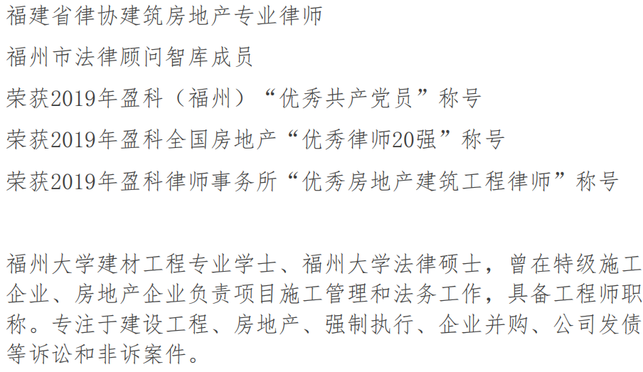榮譽:2018年福州市律師協(xié)會“首屆福州市青年律師模擬法庭大賽”第二名,賽事”優(yōu)秀代理人”、?入選福建省第四期優(yōu)秀青年律師人才庫