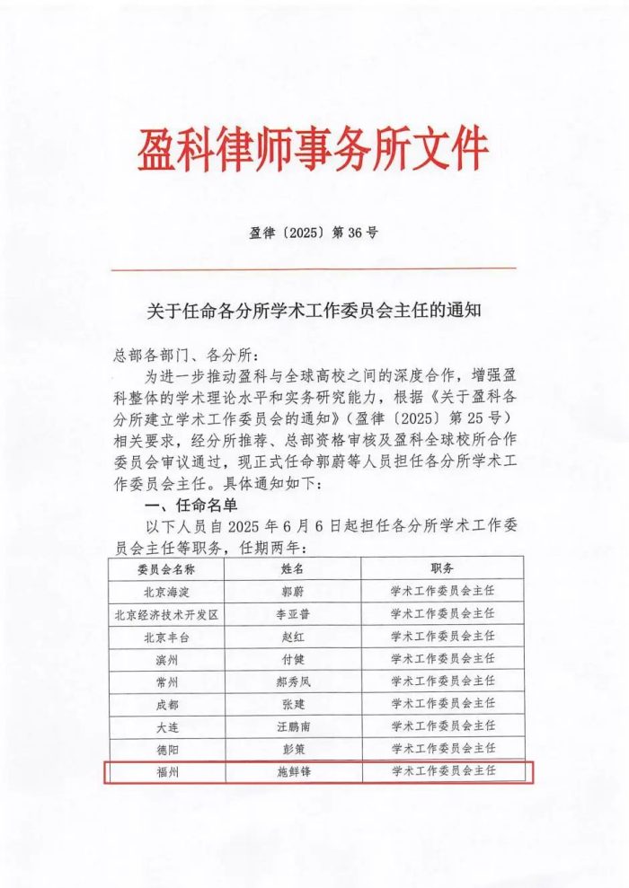 施鮮鋒律師擔(dān)任盈科福州律師事務(wù)所學(xué)術(shù)工作委員會(huì)主任 福州律師資訊發(fā)布者 福州律師網(wǎng)2025年6月13日為進(jìn)一步推動(dòng)盈科與全球高校之間的深度合作,增強(qiáng)盈科整體的學(xué)術(shù)理論水平和實(shí)務(wù)研究能力,根據(jù)《關(guān)于盈科各分所建立學(xué)術(shù)工作委員詳情