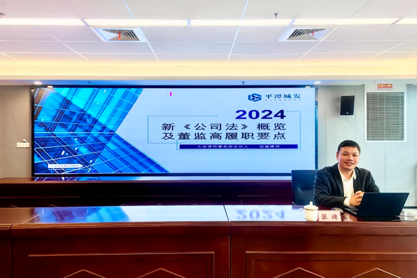 2024年4月10日,北京大成(福州)律師事務(wù)所合伙人張迪律師受平潭綜合實驗區(qū)城市發(fā)展集團有限公司(以下簡稱“平潭城發(fā)集團”)邀請,開展新《公司法》概覽及董監(jiān)高履職要點專題講座。平潭城發(fā)集團黨委副書記、黨委委員、總經(jīng)理、副總經(jīng)理,中高層管理人員、子公司班子成員及各權(quán)屬企業(yè)法務(wù)等近百人參加,就深入學(xué)習(xí)貫徹習(xí)近平法治思想,貫徹落實“八五”普法規(guī)劃要求,推動干部職工學(xué)習(xí)領(lǐng)會新《公司法》核心內(nèi)容,進一步提升依法合規(guī)經(jīng)營能力水平開展學(xué)習(xí)。
