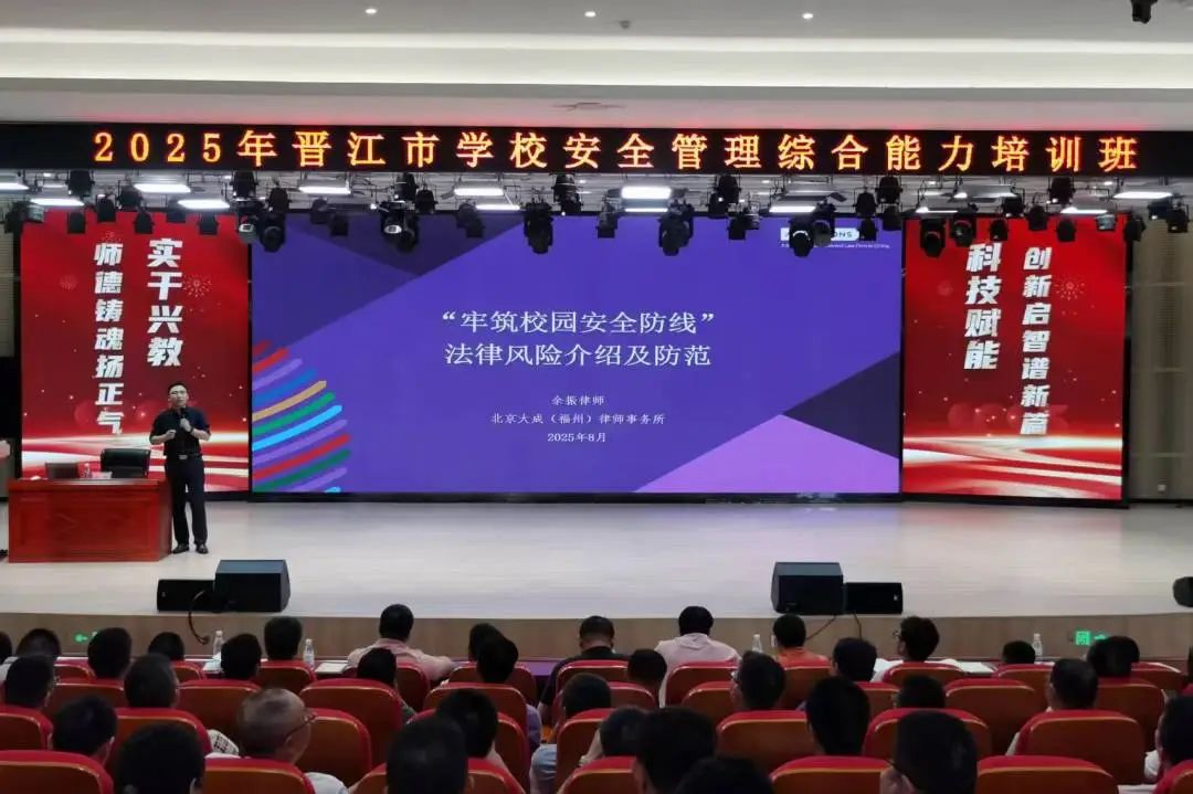 2025年8月26日,由晉江市教育局主辦、北京聯(lián)合保險經(jīng)紀(jì)福建省分公司承辦的“2025年晉江市學(xué)校安全管理綜合能力培訓(xùn)班”順利開班。北京大成(福州)律師事務(wù)所合伙人余振律師受邀以 “校園安全事故預(yù)防及處理法律事務(wù)” 為主題開展專題分享。本次活動共有六百余名來自晉江各學(xué)校分管安全的領(lǐng)導(dǎo)參加。
