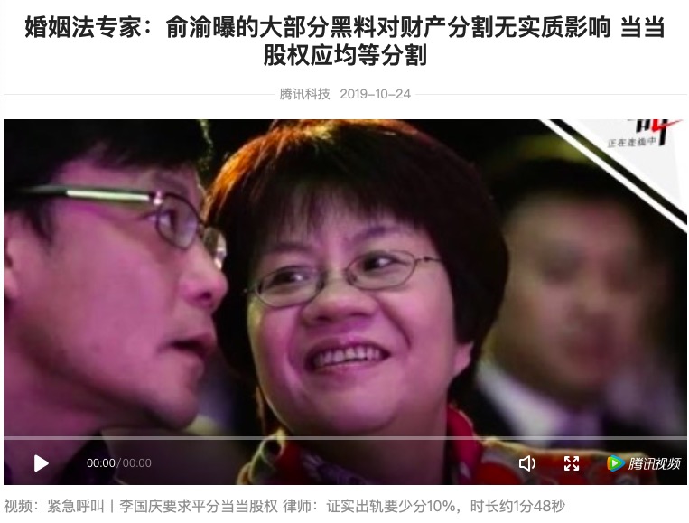 2019年10月24日,騰訊科技在騰訊新聞中發(fā)表上海錦天城(福州)律師事務所合伙人、婚姻法專家、知乎法律話題答主蔡思斌律師的文章,文章標題為《俞渝曝的大部分黑料對財產(chǎn)分割無實質(zhì)影響?當當股權(quán)應均等分割》。