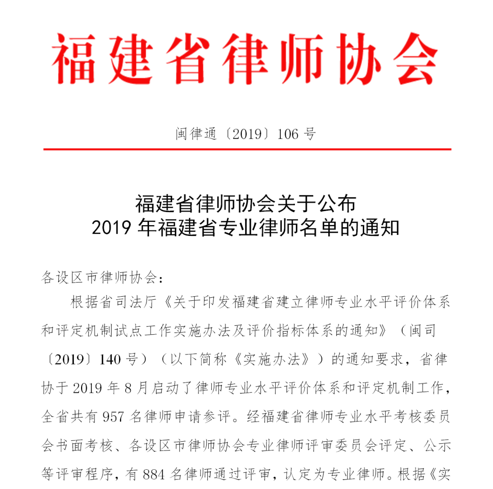 根據(jù)司法部和省司法廳工作部署,8月21日,省律協(xié)成立福建省律師專業(yè)水平考核委員會(huì),正式啟動(dòng)律師專業(yè)水平評(píng)價(jià)體系和評(píng)定機(jī)制工作。經(jīng)福建省律師專業(yè)水平考核委員會(huì)書面考核、各設(shè)區(qū)市律師協(xié)會(huì)專業(yè)律師評(píng)審委員會(huì)評(píng)定、公示等評(píng)審程序,全省957名申請(qǐng)參評(píng)的律師中,共有884名律師通過(guò)評(píng)審。