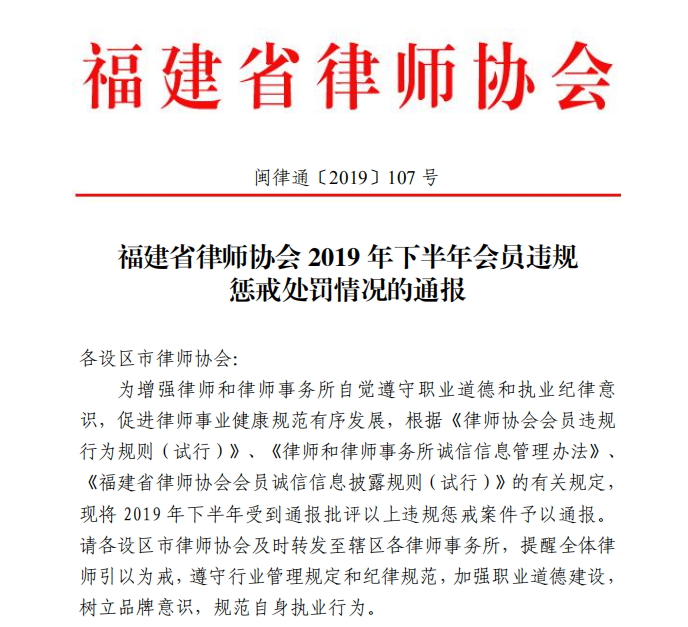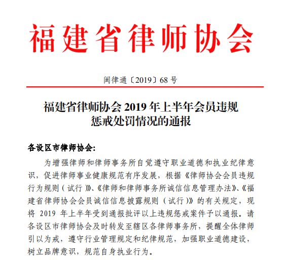 及時(shí)通報(bào)處分決定,適時(shí)發(fā)布執(zhí)業(yè)風(fēng)險(xiǎn)提示,宣傳職業(yè)道德和執(zhí)業(yè)紀(jì)律。省律協(xié)網(wǎng)站及時(shí)更新誠(chéng)信檔案數(shù)據(jù)庫(kù),嚴(yán)格落實(shí)誠(chéng)信信息披露制度。編發(fā)了兩期《2019年會(huì)員違規(guī)懲戒處罰情況通報(bào)》。