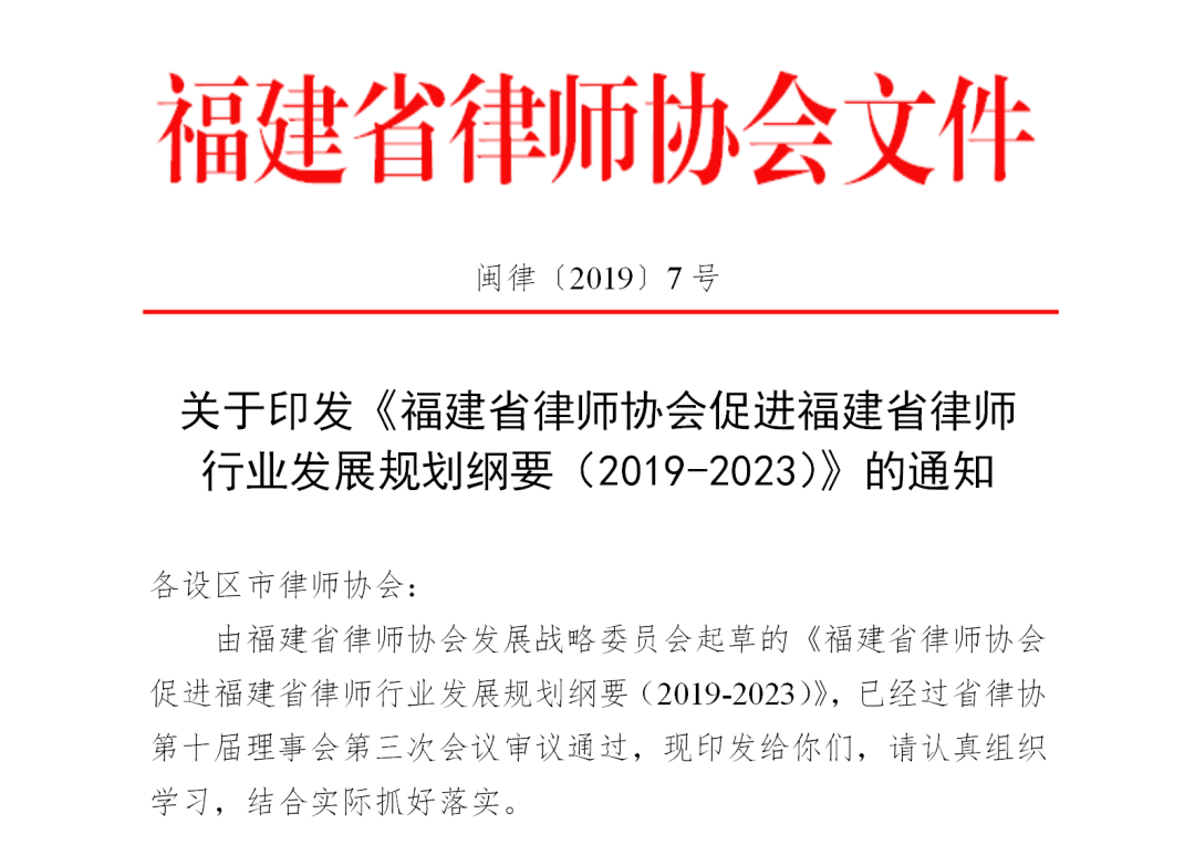 在2018年調(diào)研、起草的基礎(chǔ)上,經(jīng)過(guò)多次修改完善,編制了《促進(jìn)福建省律師行業(yè)發(fā)展規(guī)劃綱要(2019-2023年)》,于2月24日省律協(xié)第十屆理事會(huì)第三次會(huì)議審議通過(guò)。綱要從行業(yè)黨建、行業(yè)管理、隊(duì)伍建設(shè)、律師服務(wù)、行業(yè)宣傳、協(xié)會(huì)建設(shè)等方面提出具有針對(duì)性、及時(shí)性、可操作性的舉措,明確了行業(yè)的發(fā)展方向和措施,為期間的行業(yè)管理提供了依據(jù)。