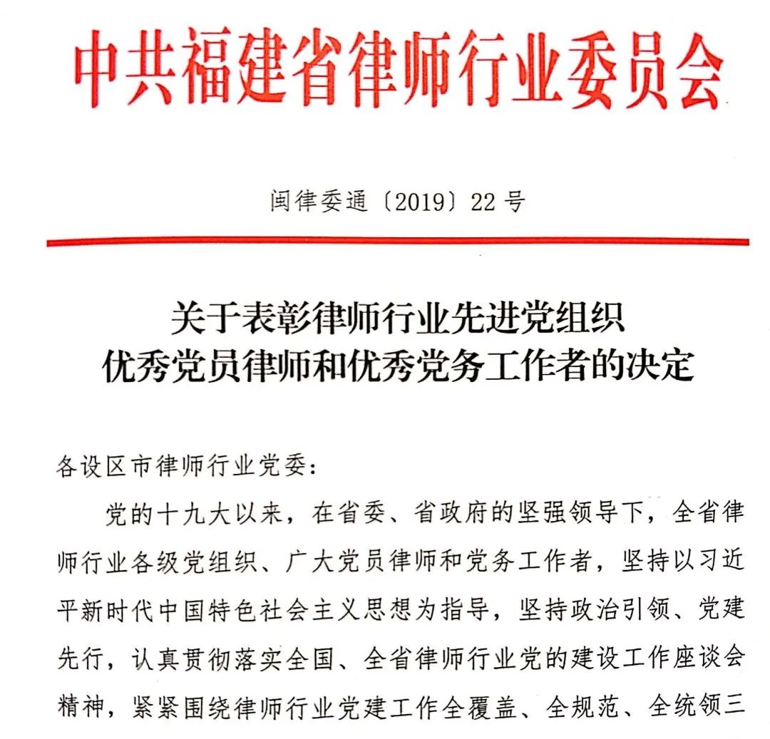 在全國(guó)律師行業(yè)黨建工作先進(jìn)典型表彰暨經(jīng)驗(yàn)交流會(huì)議上,福建建達(dá)律師事務(wù)所黨總支等3家律師事務(wù)所黨組織、許明等6名黨員律師分別榮獲“全國(guó)律師行業(yè)先進(jìn)黨組織”“全國(guó)律師行業(yè)優(yōu)秀黨員律師”“全國(guó)律師行業(yè)優(yōu)秀黨務(wù)工作者”稱號(hào)。