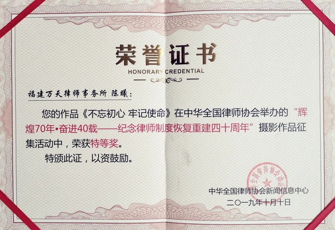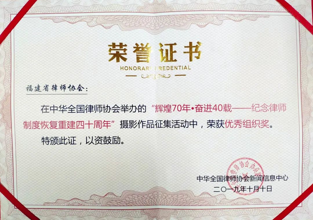 在全國(guó)律協(xié)開(kāi)展的“輝煌70年·奮進(jìn)40載——紀(jì)念律師制度恢復(fù)重建四十周年”攝影作品征集活動(dòng)中,省律協(xié)榮獲“優(yōu)秀組織獎(jiǎng)”,我省律師有8組攝影作品獲獎(jiǎng),其中三明律師陳曦作品《不忘初心 牢記使命》榮獲特等獎(jiǎng),獲獎(jiǎng)作者參加了全國(guó)律協(xié)媒體交流日活動(dòng)。