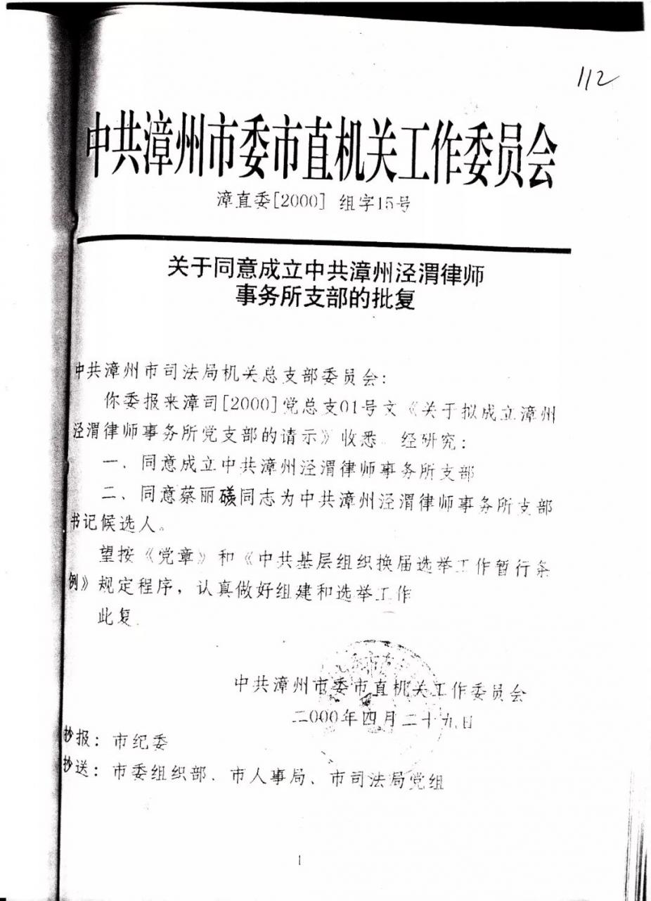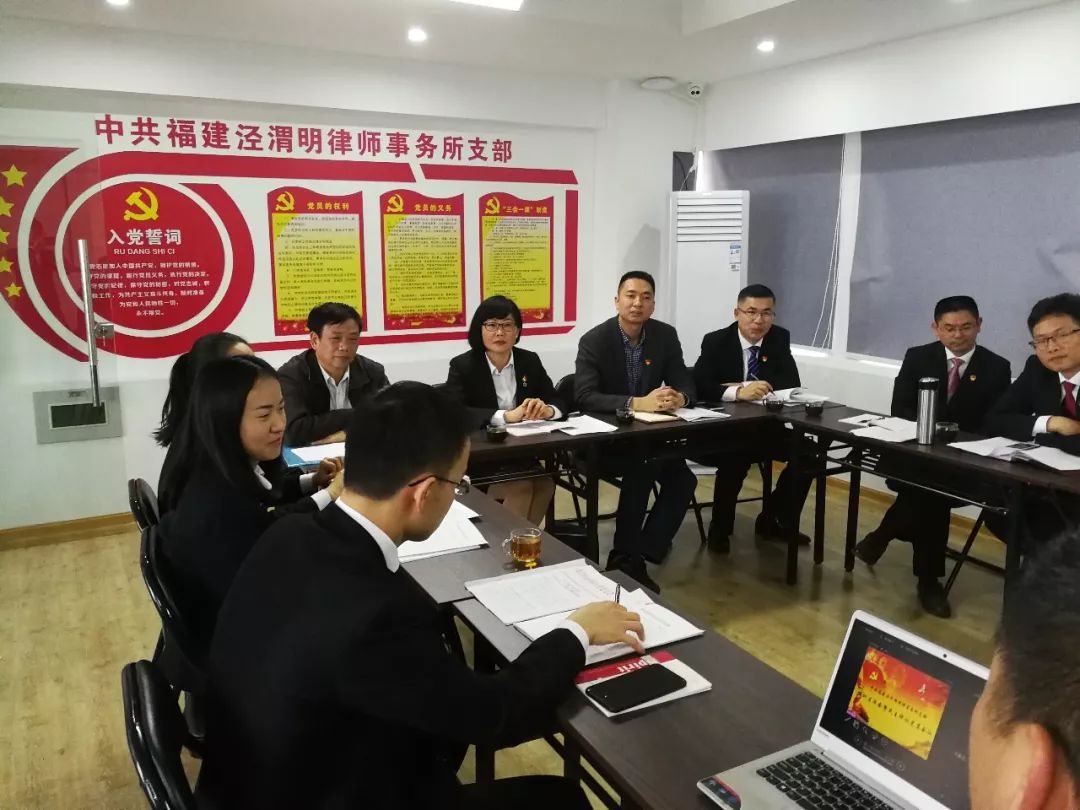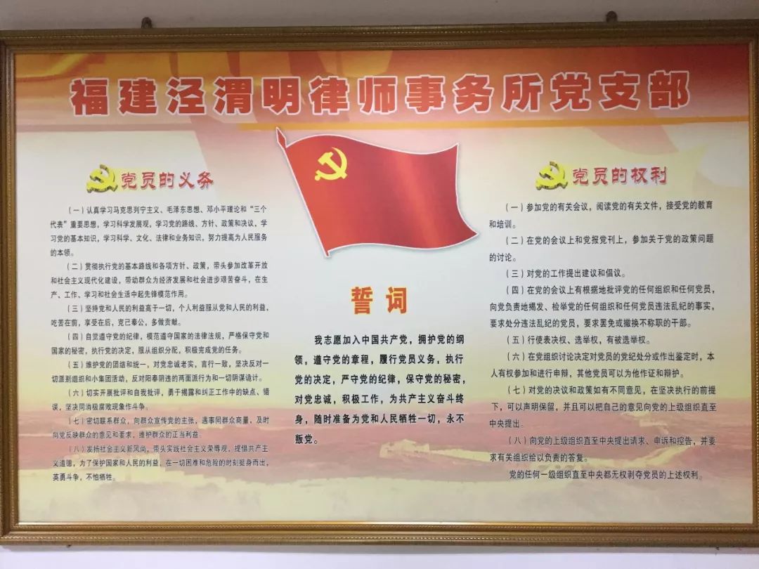 涇渭明律師事務(wù)所的黨建工作始終走在全市的前列。2000年4月29日經(jīng)中共漳州市直機(jī)關(guān)工作委員會(huì)批復(fù),涇渭明律師事務(wù)所在全市23家律師事務(wù)所中率先成立黨支部。