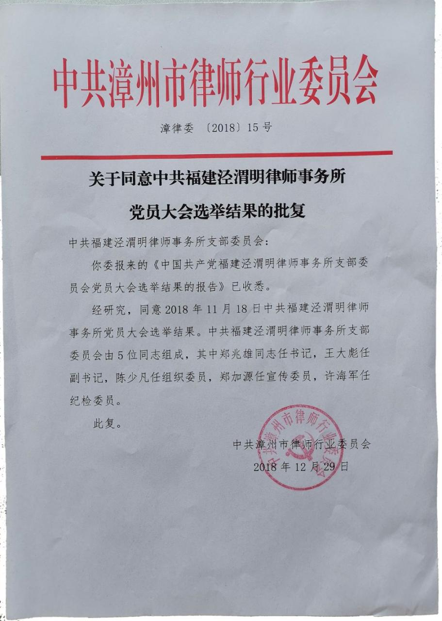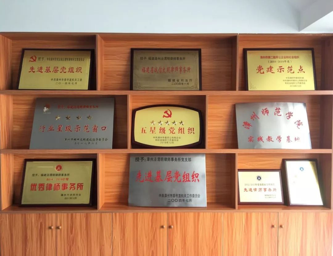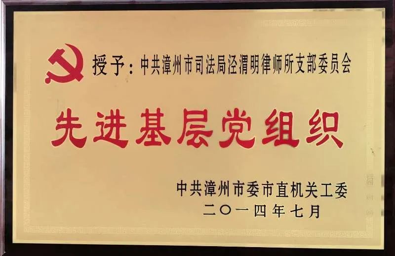 2018年,在上級(jí)黨委關(guān)心指導(dǎo)下,全所黨員律師不懈努力,成績顯著,中共福建涇渭明律師事務(wù)所支部因此被確定為“(2018-2019年度)漳州市第二批非公企業(yè)和社會(huì)組織黨建示范點(diǎn)”,被中共漳州市委非公有制企業(yè)和社會(huì)組織工作委員會(huì)評(píng)選為“五星級(jí)黨組織”。