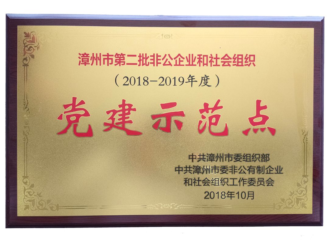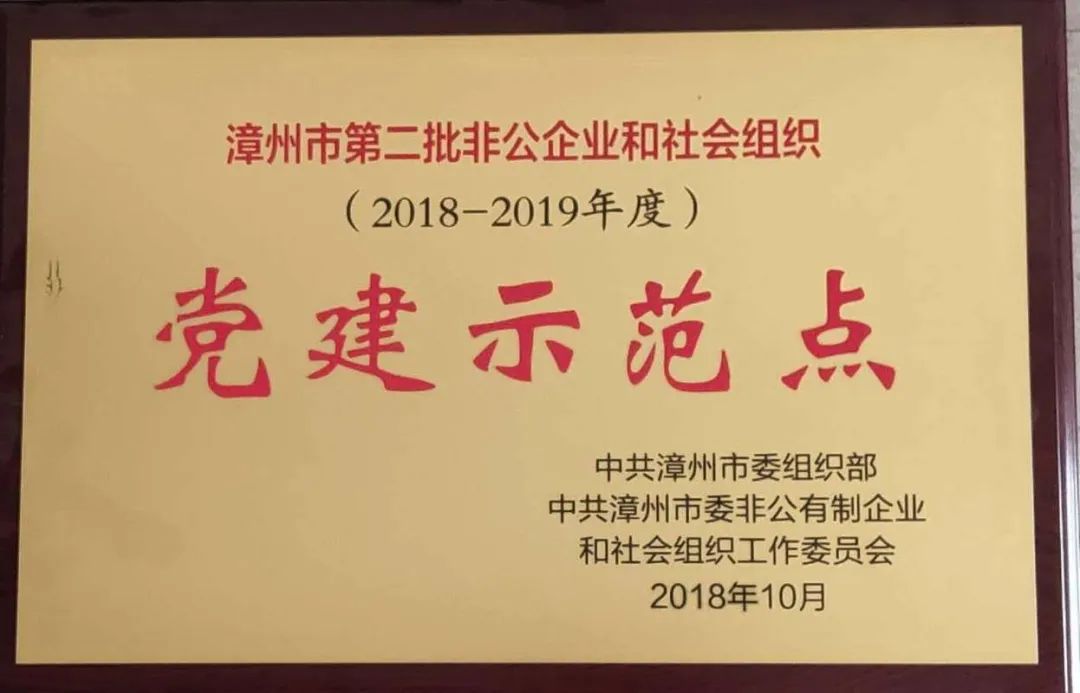 *2018年10月我支部獲中共漳州市委組織部、中共漳州市委非公有制企業(yè)和社會(huì)組織工作委員會(huì)授予“漳州市第二批非公企業(yè)和社會(huì)組織(2018-2019年度)黨建示范點(diǎn)”。