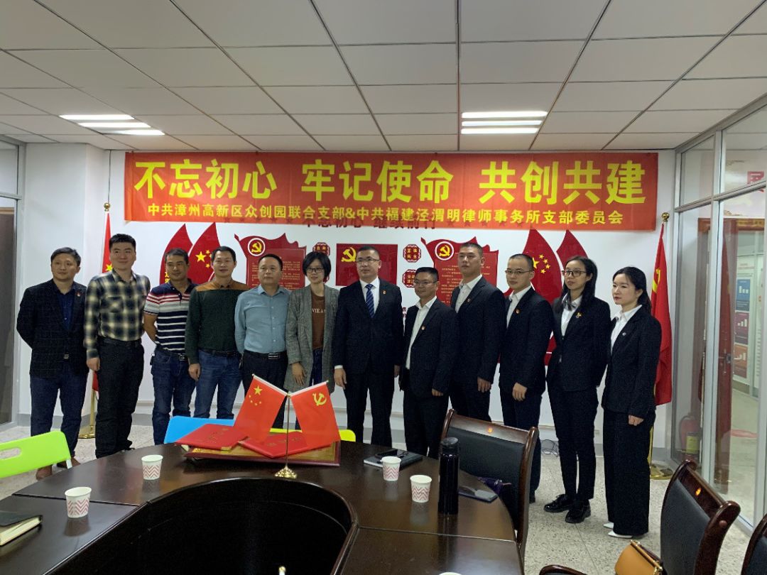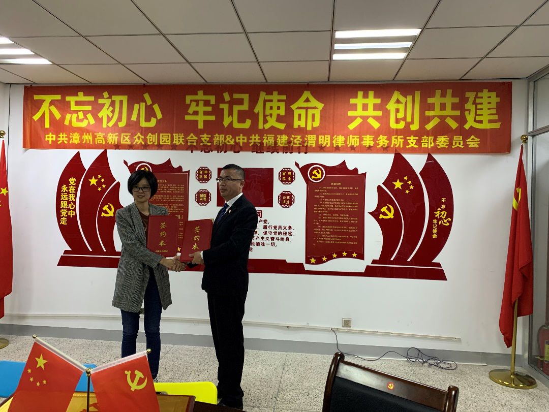 2019年11月21日下午,中共福建涇渭明律師事務(wù)所支部委員會(huì)與中共漳州高新區(qū)眾創(chuàng)園聯(lián)合支部在高新區(qū)眾創(chuàng)園內(nèi)開展以“不忘初心,牢記使命,共創(chuàng)共建”為主題的黨建共建活動(dòng),并簽署黨建共建合作協(xié)議。