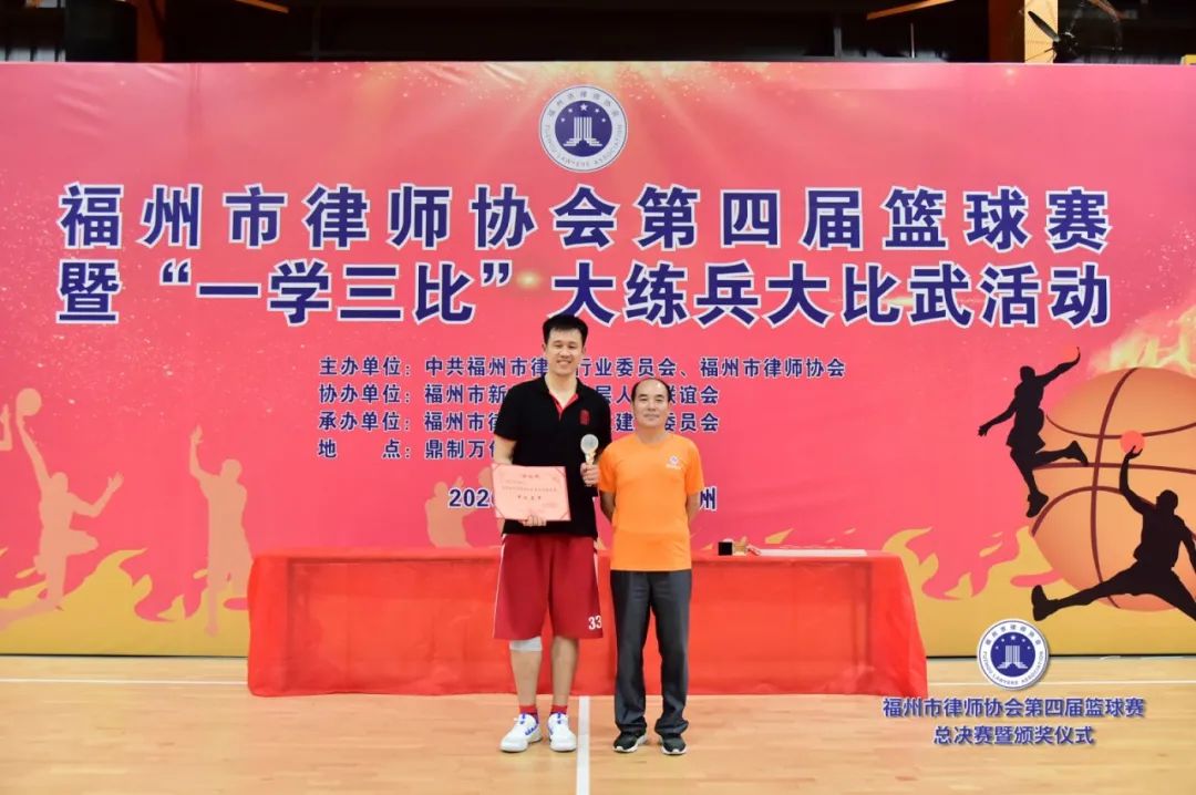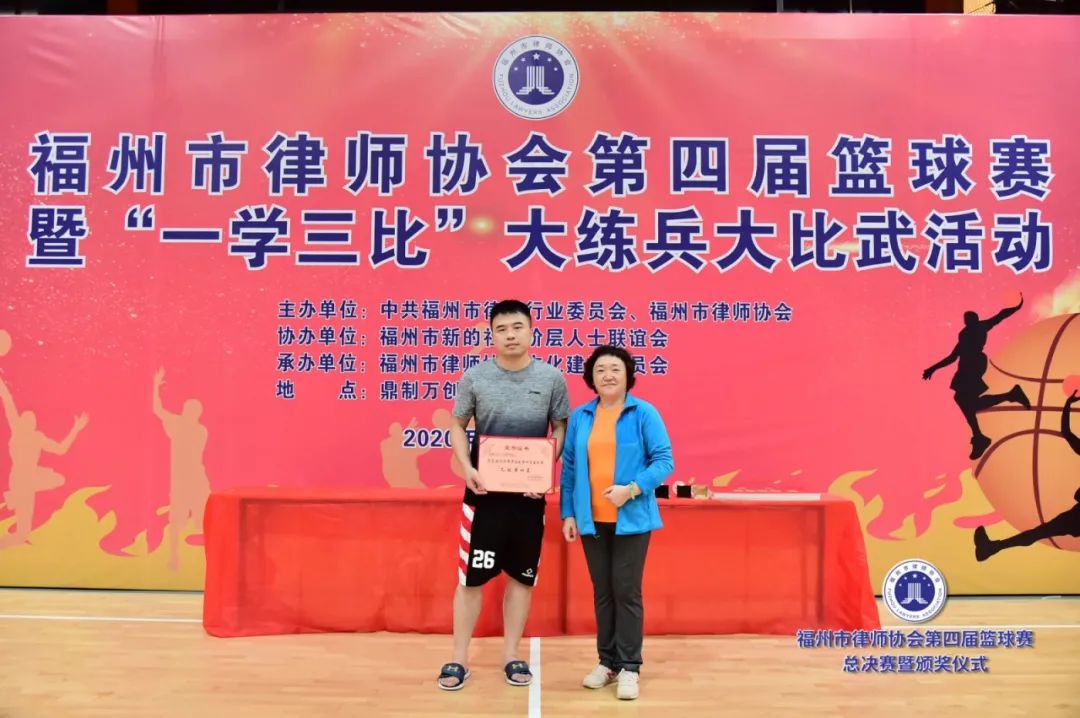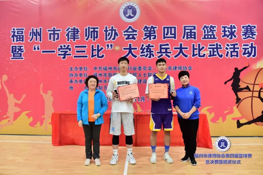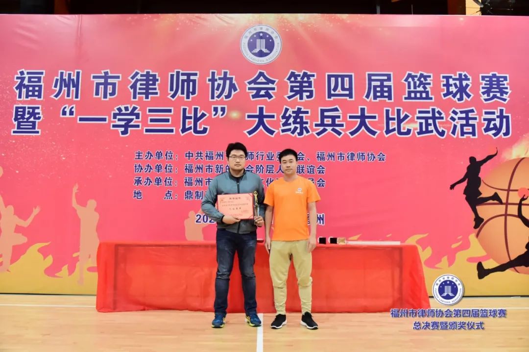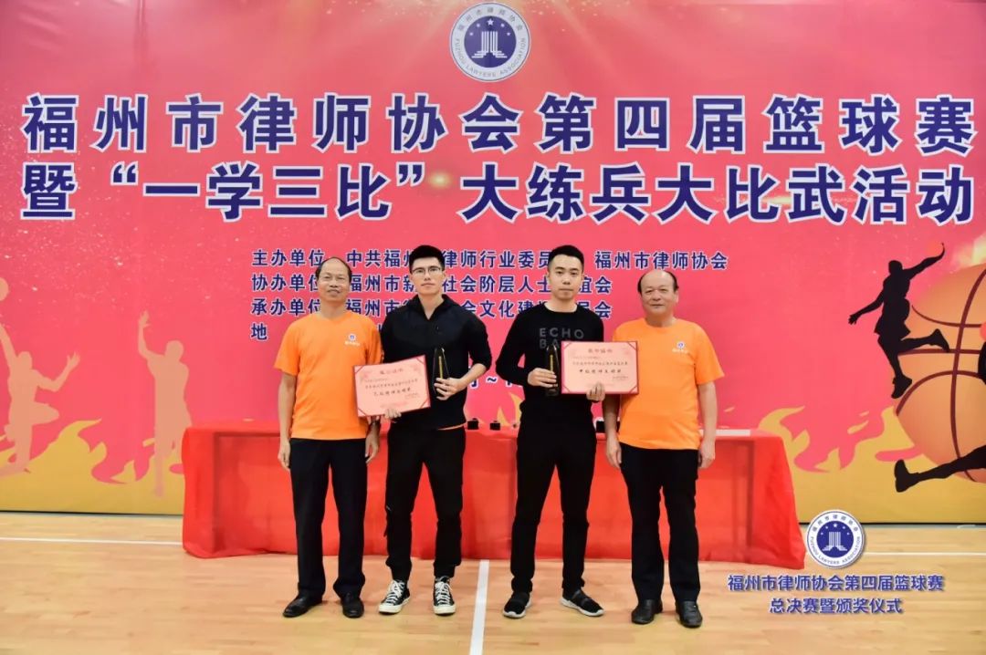 副會(huì)長(zhǎng)吳玉姜、陳立新為獲得最有價(jià)值球員獎(jiǎng)的北京大成(福州)律師事務(wù)所潘澤煒(甲級(jí))、福建閩眾律師事務(wù)所黃開(kāi)捷頒獎(jiǎng)(乙級(jí))▲