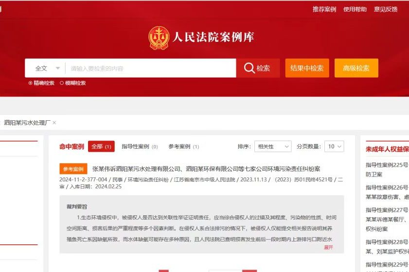近日,張某偉訴江蘇泗陽(yáng)海峽污水處理有限公司、泗陽(yáng)某環(huán)保有限公司等七家公司環(huán)境污染責(zé)任糾紛案被最高人民法院入選人民法院案例