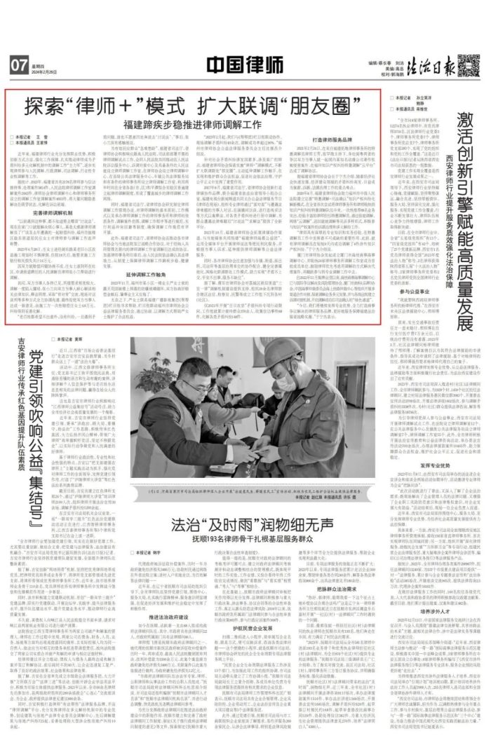 新春“開門紅”!《法治日報》突出報道福建省律師調(diào)解工作 福州律師資訊發(fā)布者 福州律師網(wǎng)2024年3月4日2月29日,中央政法委機(jī)關(guān)報《法治日報》“中國律師”版頭條刊發(fā)通訊稿件《探索“律師+”模式 擴(kuò)大聯(lián)調(diào)“朋友圈”——福建蹄詳情